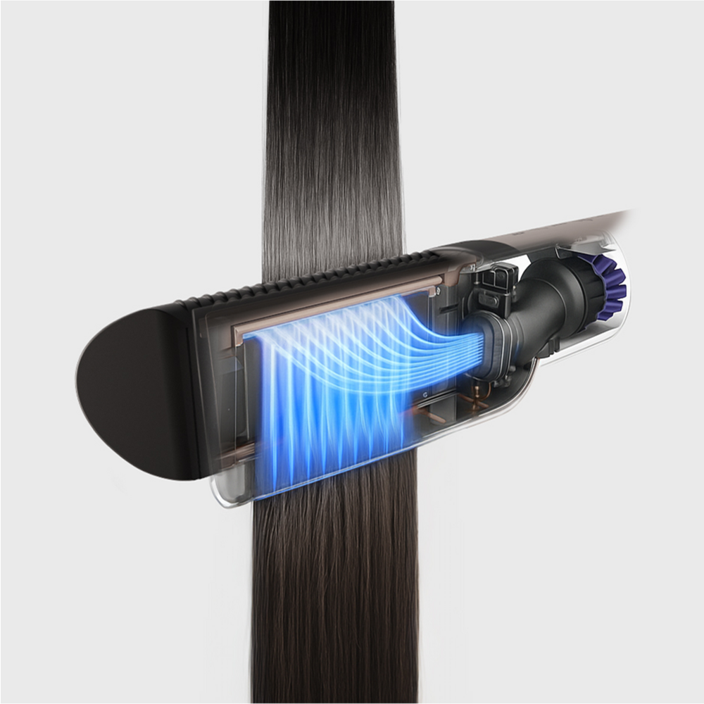 Фен-выпрямитель сочетает в себе передовые технологии укладки и бережного выпрямления волос. Мощный направленный поток создает зону низкого давления, мягко «затягивая» пряди в воздушную прослойку между пластинами. Волосы свободно парят в потоке нагретого воздуха, который ускоряет испарение влаги и одновременно разглаживает кутикулу за счет оптимального натяжения прядей. В отличие от обычных выпрямителей, фен бережно ухаживает за волосами, от корней до кончиков делая их гладкими и послушными, как после салонного ламинирования.